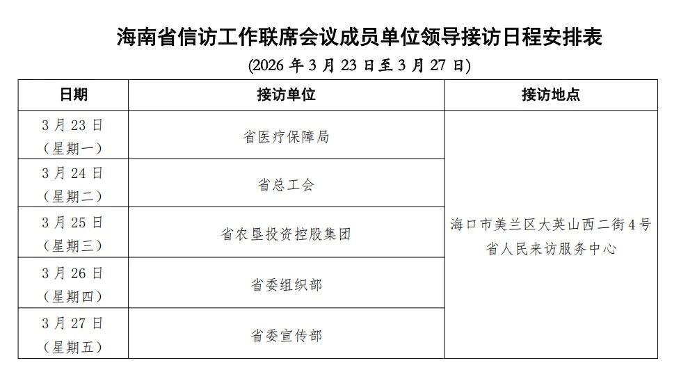 海南省信访工作联席会议成员单位领导3月23日至27日接访日程公布