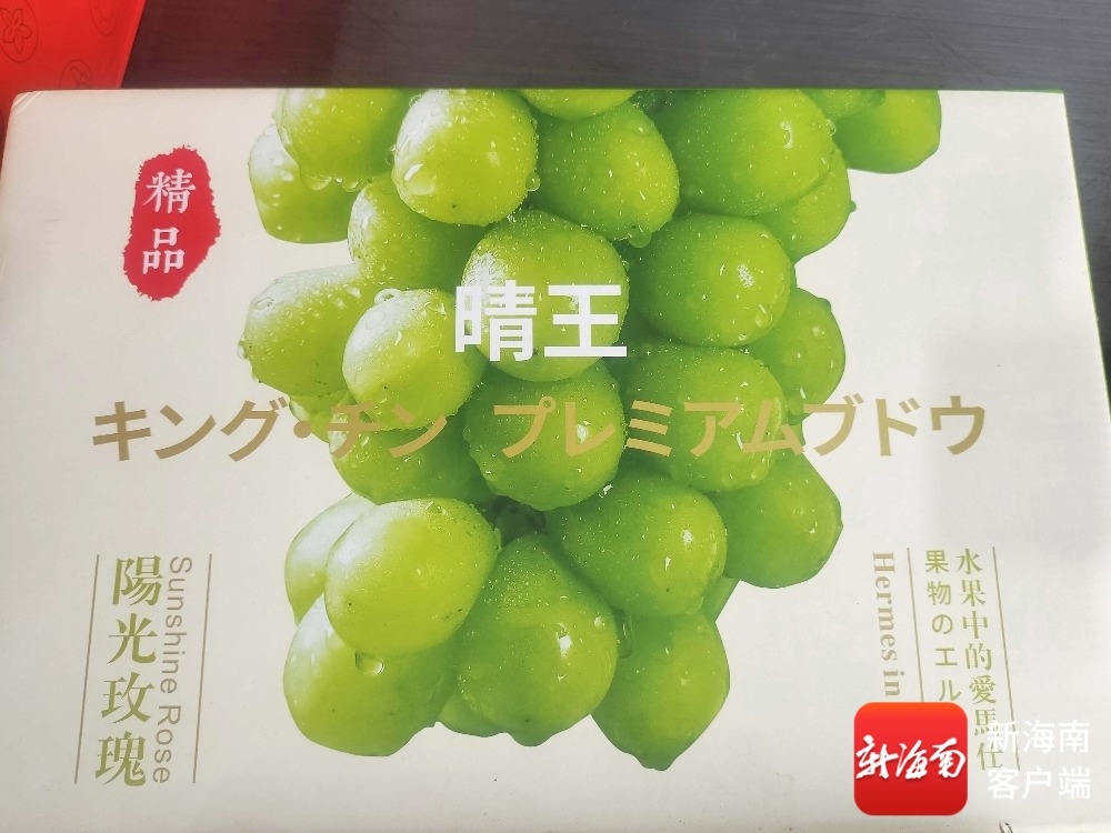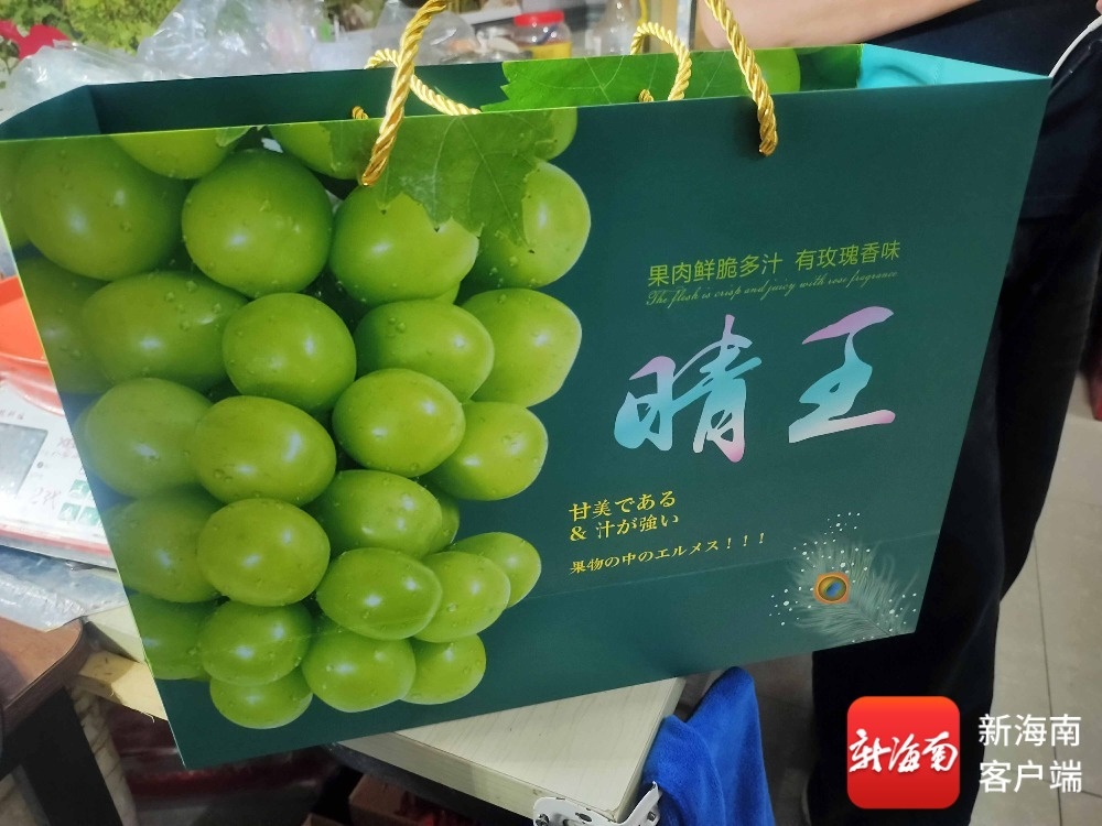 在琼山区南北水果市场一家销售包装箱的店铺内,记者在该店货架上,看到一款水果包装的礼盒,同样标有“晴王”以及一些日文字样,右下角处还写有“水果中的爱马仕”。该店店员介绍称,这样的礼盒是他们店自己制作的,不带提手袋,整体质量不错,放三串“阳光玫瑰”,可用于快递运输,即使记者要100个的话,他们也有库存。