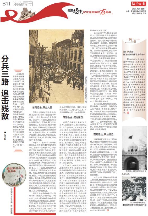 海口市解放。随后,渡海大军在琼崖纵队配合下,分东、中、西三路追击逃敌