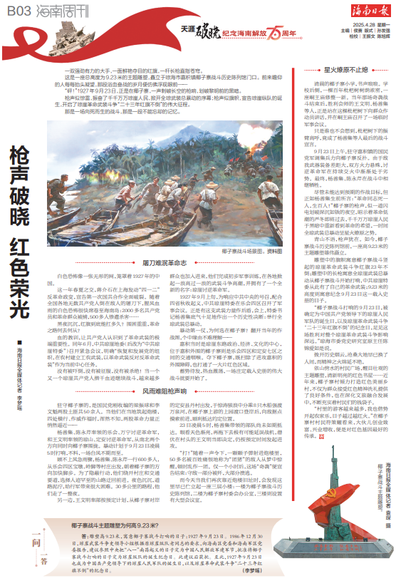 枪声似惊雷,振奋了千千万万琼崖人民,掀开全琼武装总暴动的序幕;枪声似旗帜,宣告琼崖纵队的诞生,开启了琼崖革命武装斗争“二十三年红旗不倒”的伟大征程。
