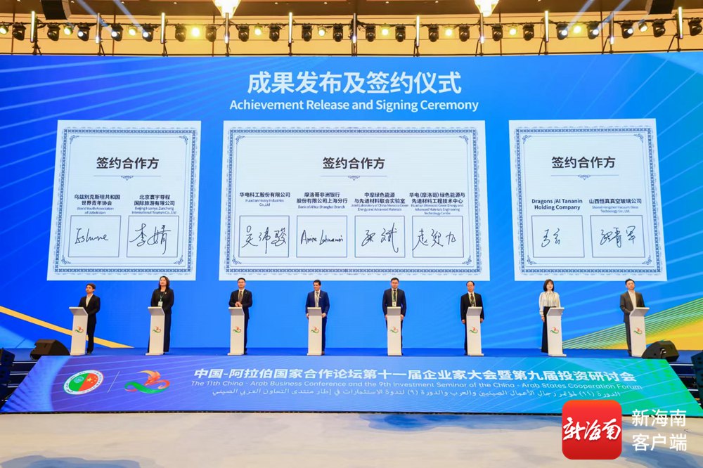 当天,海南自贸港与阿拉伯国家自贸园区签署合作备忘录,海南省贸促会与一批境外商协会签约。文昌市政府、海口高新区、海南跨境产业互联(中东)示范园、海南自贸区德航集团有限公司分别与相关企业签署合作备忘录。乌兹别克斯坦共和国世界青年协会与北京、山西企业签署合作协议,摩洛哥企业就绿色能源和先进材料方面与我国企业签署四方合作备忘录。进一步推动中阿双方在经贸、人文等领域实现互利共赢,共绘发展新蓝图。