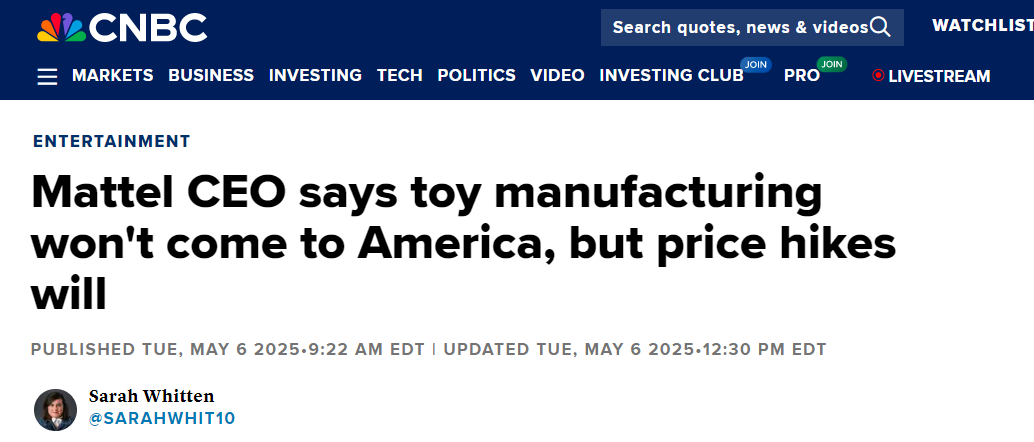 美国CNBC网站援引美泰(Mattel)玩具首席执行官伊农·克雷兹的说法,特朗普政府145%的对华关税不会将玩具制造业带回美国,反而将推高价格。玩具利润率通常仅为个位数,企业几乎无法吸收关税成本,预计2025年返校季价格将显著上涨。