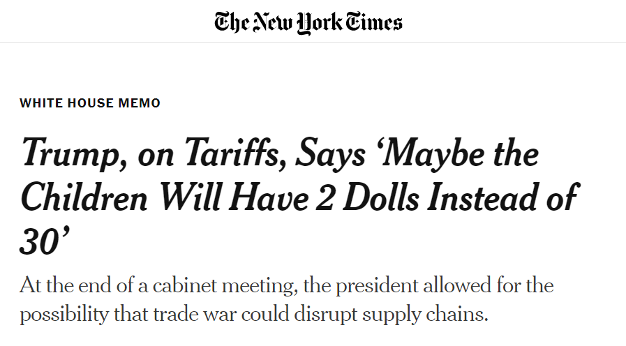 中国日报网5月8日电 日前,美国总统特朗普承认,其关税政策可能会导致美国商店里货架更空,商品价格更高,特别是玩具店。“也许孩子们只能拥有2个娃娃了,而不是30个,而且这2个娃娃可能还会比以往贵上几美元。”
