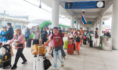 旅客乘坐中老铁路国际旅客列车到达磨憨铁路口岸。黄远飞 摄