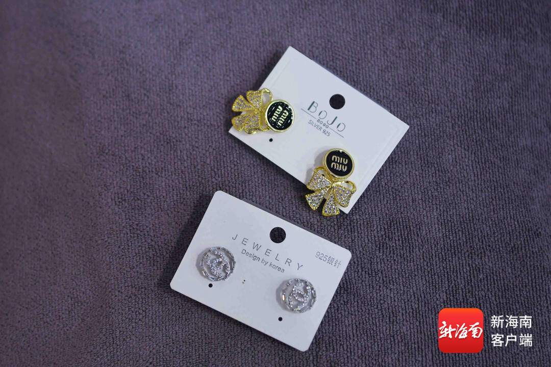 见到有执法人员在一旁检查,原本已开门营业的海口琼山某玲饰品店却突然关了门内的灯,然后拉上了门帘准备离开。“麻烦您将门帘打开,我们要对你店内销售的产品进行检查。”执法人员见状后,立即上前表明身份,要求该店工作人员配合检查。记者在该店内首饰品区域内,各式各样耳环琳琅满目,但在几只销售的耳钉、耳环上,却明显使用“PRADA”、“MIUMIU”图形商标。