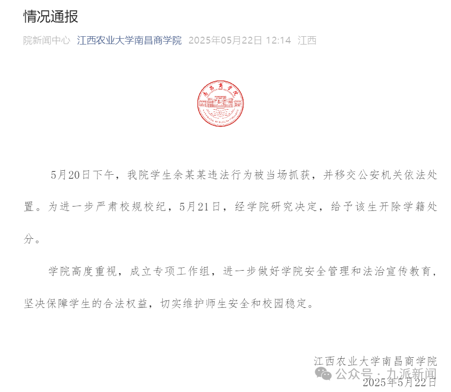 5月22日,江西农业大学南昌商学院发布情况通报称: