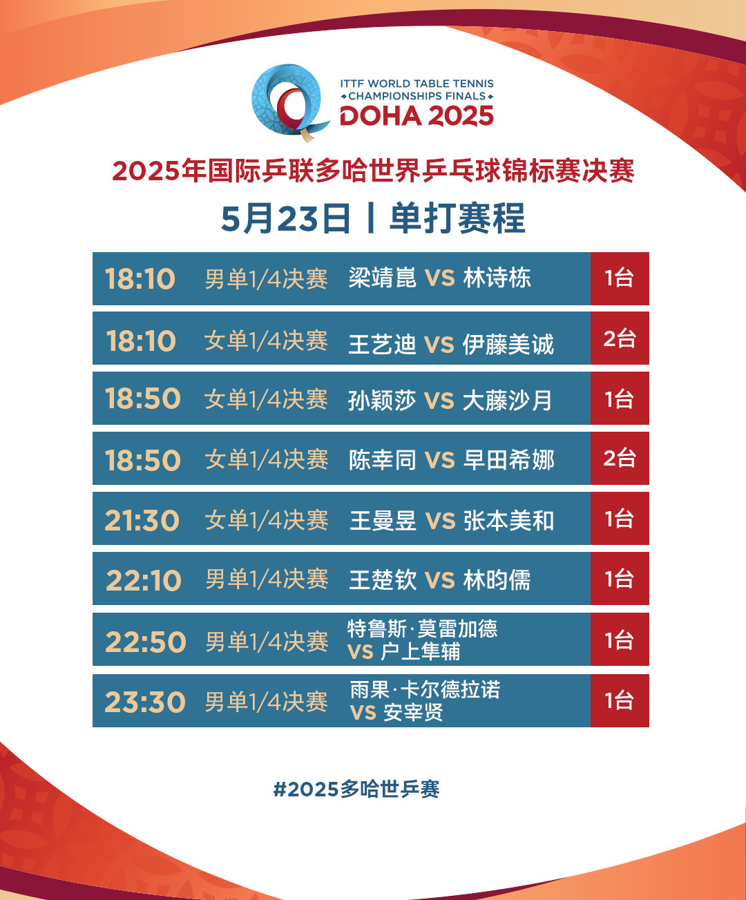 国乒加油!女单将上演4场“中日对决” 多哈世乒赛第七日赛程→