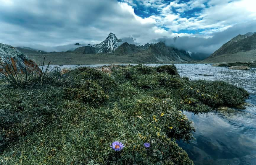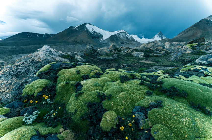 第二天一早,我们继续向山脉的腹地去探索,前往冷布岗日腹地的道路也是无人踏足的,没有正规车道的,所以我们同样只能沿着牧民留下的车辙印前行。在一望无际的高原上,我们找不到路的时候就操纵无人机升空去探索路线。经过了一整天的艰难探索,终于抵达了目的地,这个地方再往上走是完全没有路了。在海拔约5800米左右的这个地方,不仅有巍峨壮美的雪山,还长着很多这种独特的高山苔藓,这种植被通常只分布在海拔4000米以上的地区,极具地域特色。所以在拍摄时,我将这些高原特有的植被作为前景,既展现了高原生态风貌,也作为海拔高度的天然标识,然后远处雄伟的冷布岗日雪山则构成了画面的核心部分。