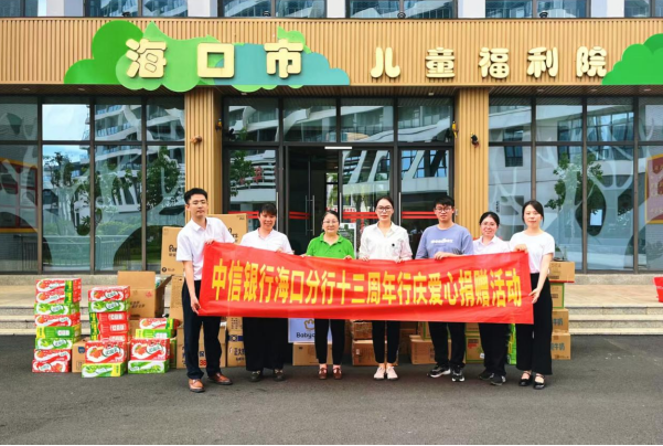 在中信银行海口分行十三周年行庆和国际“六一”儿童节来临之际,该行组织开展了“迎行庆,献爱心”主题捐赠活动,在分行团委的号召下,全行员工主动响应、各单位积极组织,通过物资捐赠与金融知识普及相结合的形式,为海口市社会福利院的儿童及青少年送去节日的关爱与支持,以实际行动践行金融机构的社会责任。
