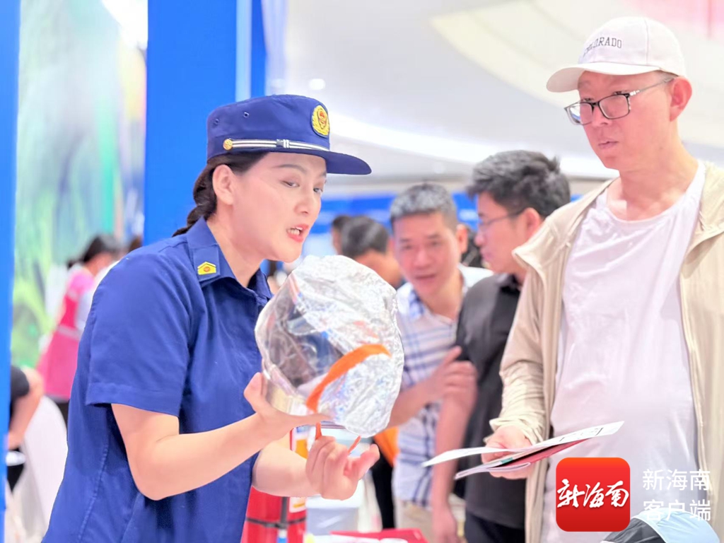 三亚消防展台前,专业人员细致讲解如何正确使用呼吸面罩、家庭火灾科学逃生技巧。记者 胡丽齐 摄