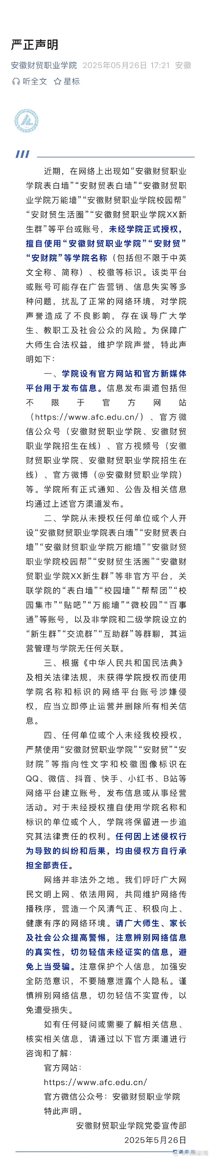 5月26日,安徽财贸职业学院发声明:近期,在网络上出现如“安徽财贸职业学院表白墙”“安财贸表白墙”“安徽财贸职业学院万能墙”“安徽财贸职业学院校园帮”“安财贸生活圈”“安徽财贸职业学院XX新生群”等平台或账号,未经学院正式授权,擅自使用“安徽财贸职业学院”“安财贸”“安财院”等学院名称(包括但不限于中英文全称、简称)、校徽等标识。该类平台或账号可能存在广告营销、信息失实等多种问题,扰乱了正常的网络环境,对学院声誉造成了不良影响,存在误导广大学生、教职工及社会公众的风险。为保障广大师生合法权益,维护学院声誉,特此声明如下: