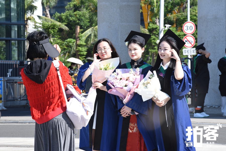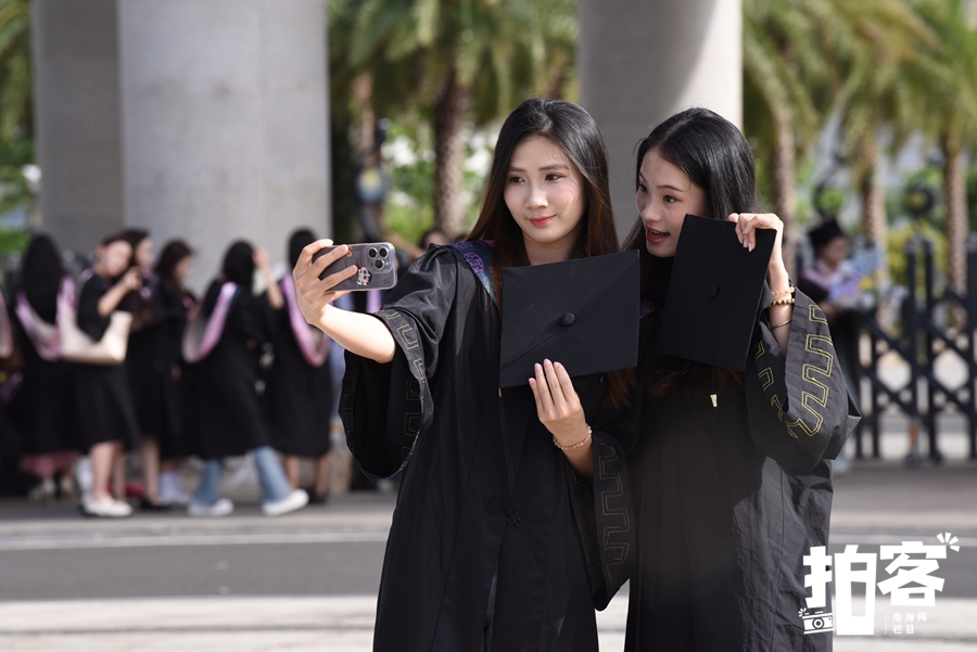 盛夏时节,海南大学校园内,一池荷花悄然绽放,碧绿的荷叶层层叠叠,粉白的花苞次第展开。正值毕业季,新南门的楑树下、协同创新中心的拱形走道上、朝华楼的明亮大厅里,以及东坡湖畔椰影婆娑的美景中,到处可见身着学位服的毕业生们。他们或三五成群地用手机自拍,或与恩师亲切交谈,或与父母紧紧拥抱。学士帽上的流苏轻轻摇曳,相机快门声此起彼伏,将青春最美好的瞬间定格在了椰风荷韵之中。