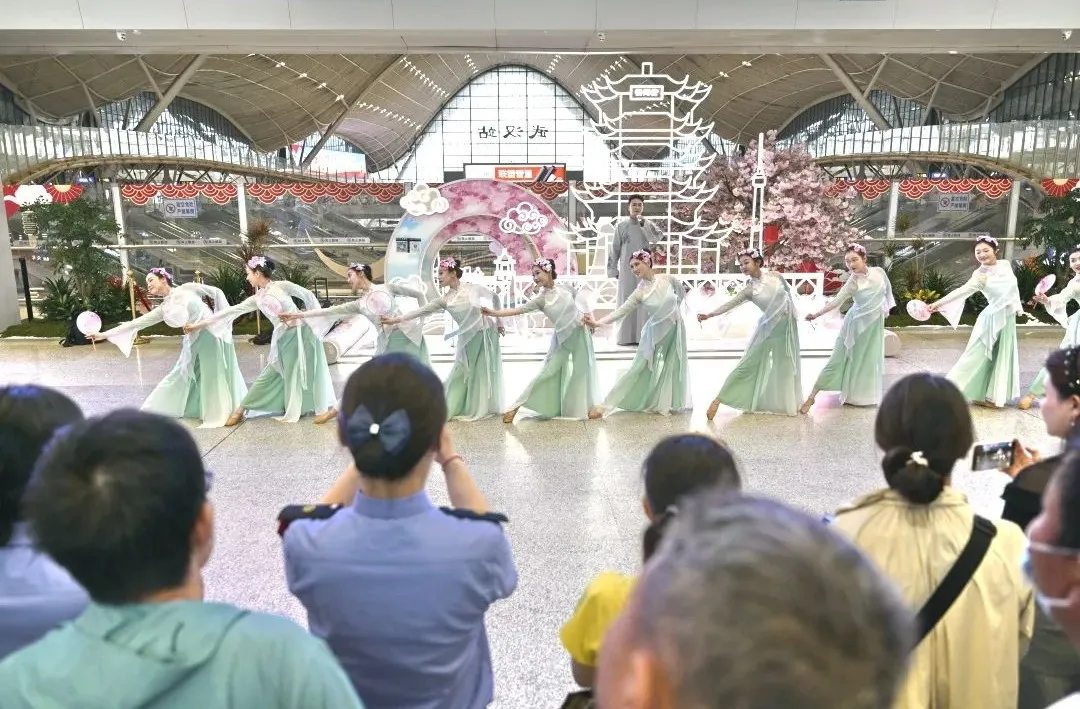 看武汉站,“文化列车千里行”端午惠民演出火热开场。湖北大鼓《有意思》以诙谐唱腔演绎市井智慧,铿锵鼓板点燃全场;武汉客运段职工演绎舞蹈《瑶光赋》,诠释了“列车穿越山河”的诗意旅程,为旅客的端午出行增添了别样色彩。