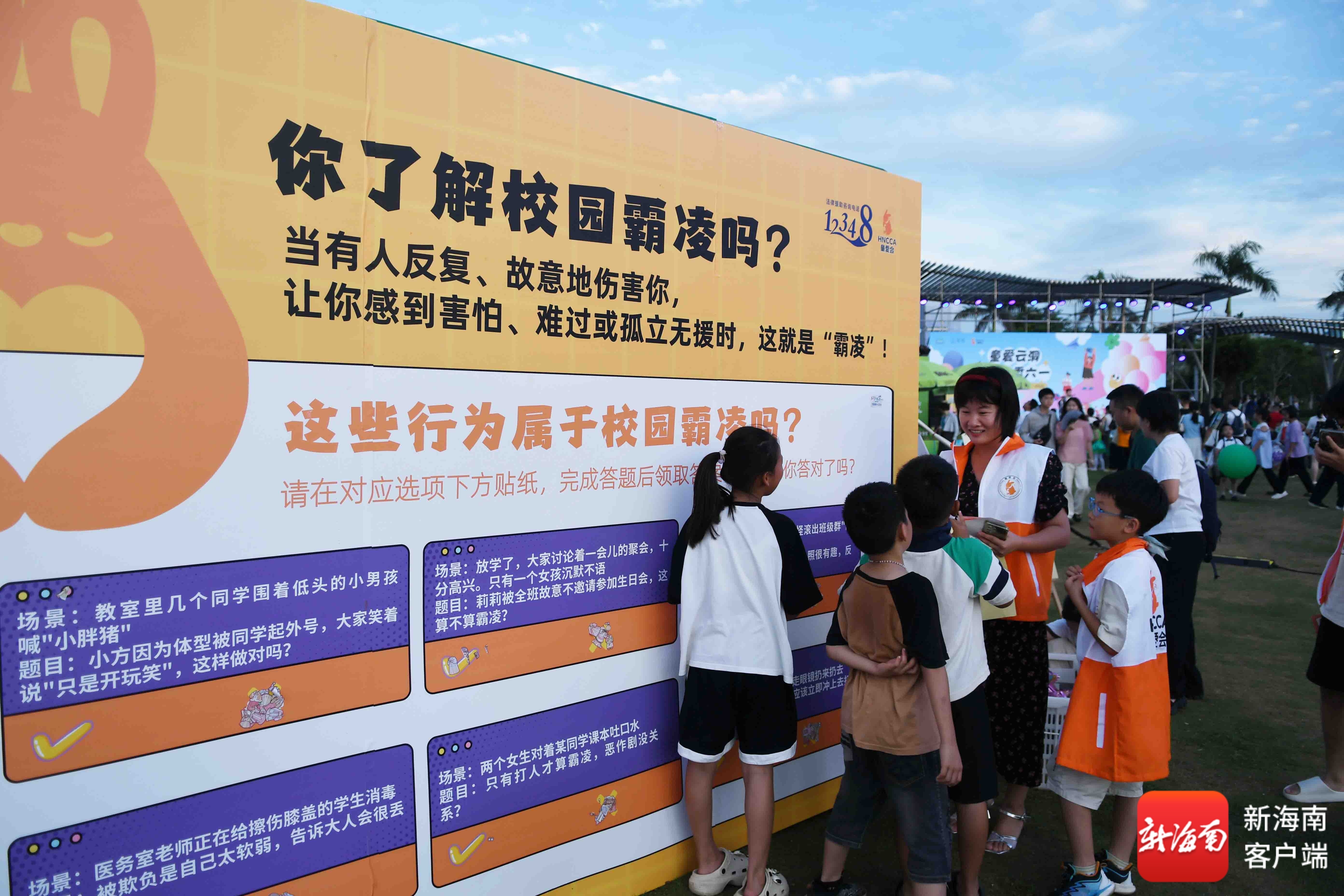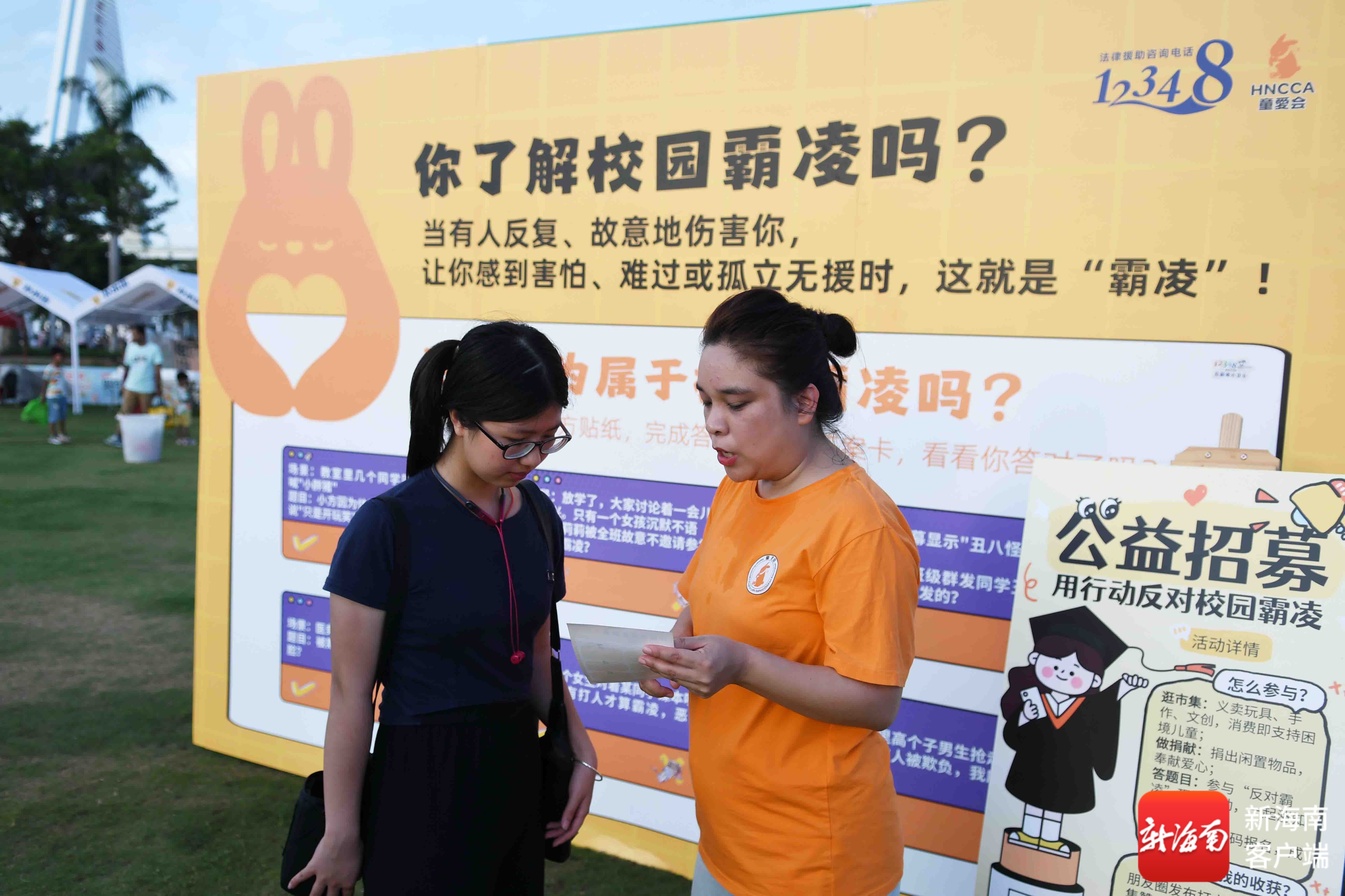 南海网、新海南客户端6月2日消息(记者 蒙健 文/图)6月1日,海南省留守儿童关爱志愿者协会(以下简称:童爱会)开展“童爱六一、书香云洞”公益市集在海口世纪公园举办,此次活动包括有开展义卖、反对校园霸凌知识宣传等内容,得到了不少家长和孩子们积极参与并予以支持。