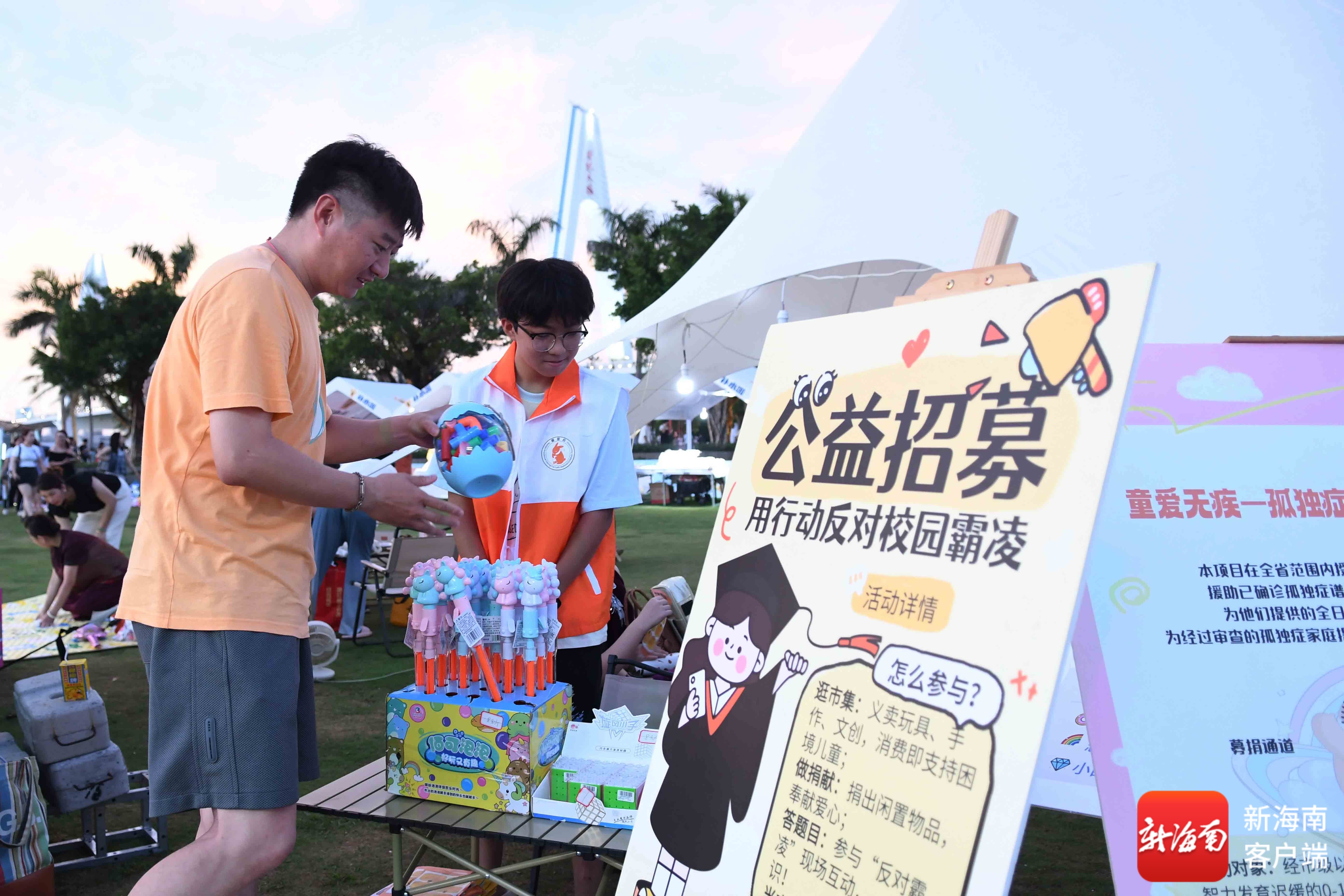 当天傍晚,位于海口世纪公园的集市嘉年华现场热闹非凡、童真燃动。活动现场包括有反对校园霸凌知识宣传、物品义卖、义演三个版块。义卖现场,不少志愿者与孩子拿着家里闲置的图书、玩具、文具等进行义卖,每个摊位都精心设计了创意招牌,孩子们将精心挑选的闲置物品整齐地摆开,儿童玩具、学习用品、绘画手工作品等琳琅满目,有的孩子还自己动手编织了五彩斑斓的爱心手提包。孩子们大胆当起“小老板”,卖力吆喝、热情招呼卖家,用心推销自己的商品。
