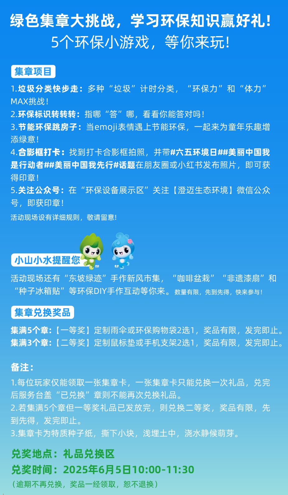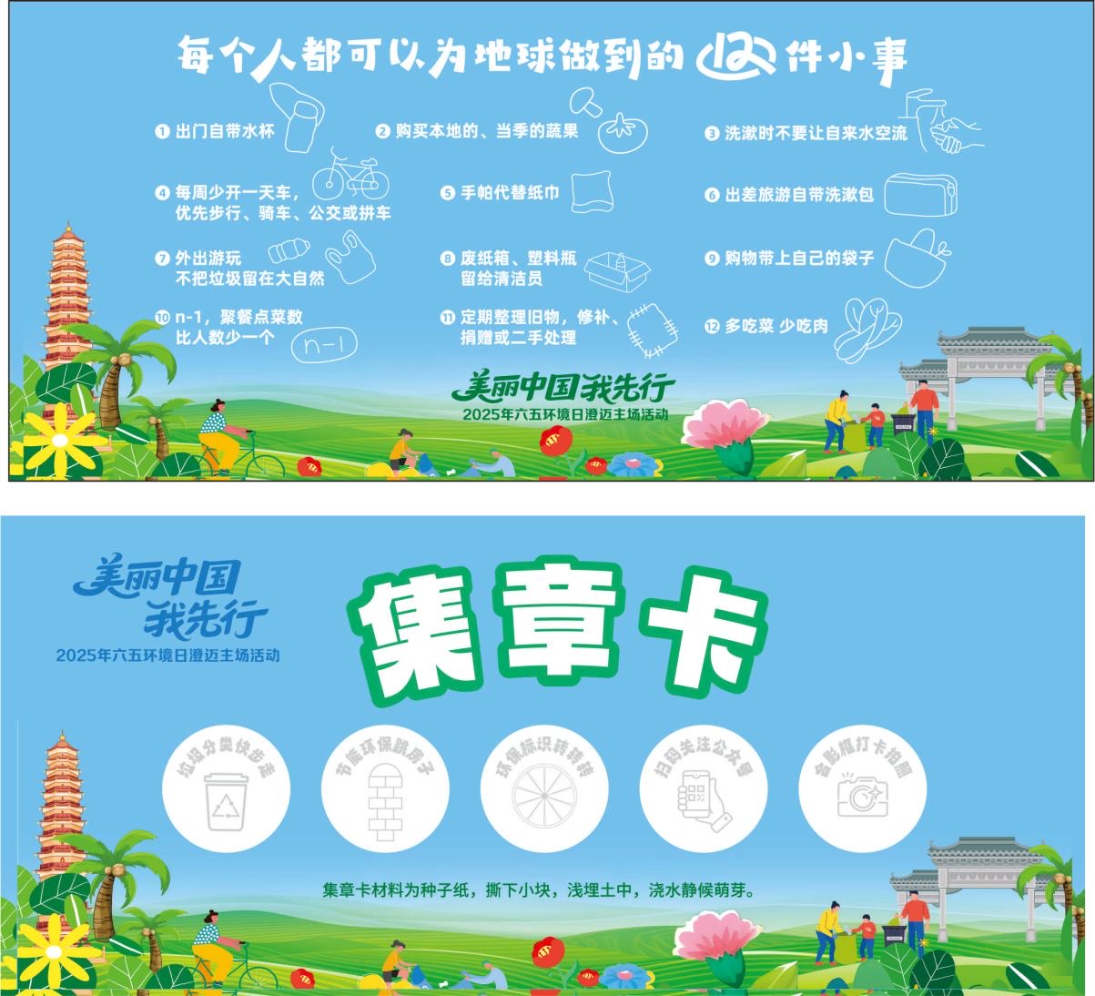 活动现场将设绿色环保签到、环保成果展浏览、环保游戏、环保手工市集、环保主题文艺表演及古村生态研学六个环节,参与者可以通过沉浸式体验,学习环保知识,感受澄迈之美。现场更准备了种子纸集章卡,参与者参与现场互动游戏,每闯一关即可集一枚印章,集满3至5枚可兑换定制雨伞、环保购物袋等礼品。种子集章卡还可以带回家进行种植。一系列丰富的活动,引导公众从“旁观者”变为“行动者”。