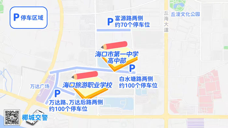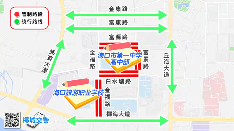 非考试车辆请选择富康路、富景路、椰海大道、丘海大道绕行。
