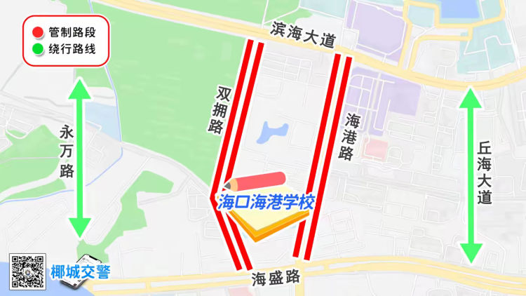 途经社会车辆请绕行滨江路、椰博路,避开考点管制路段。