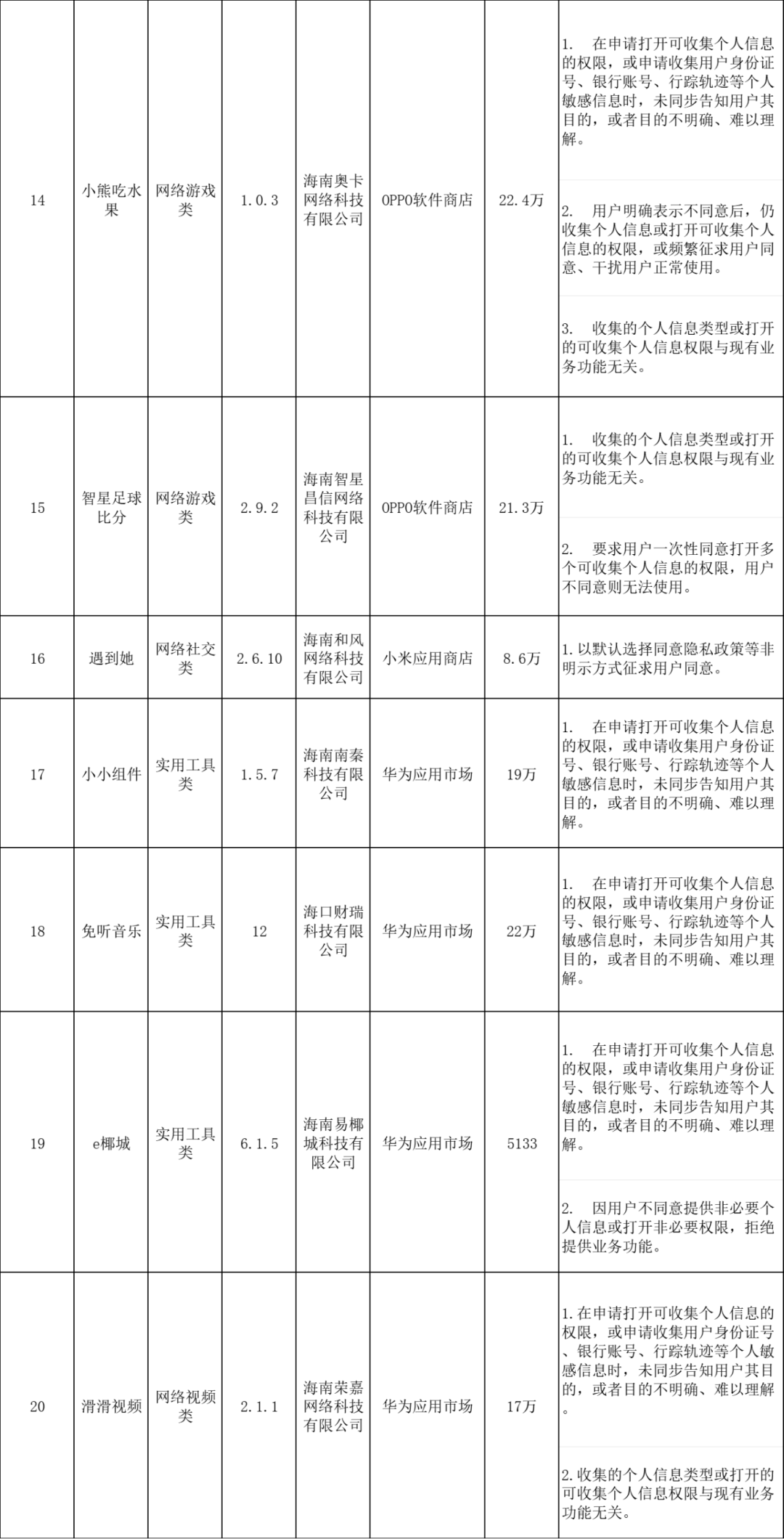海南通报20款移动应用程序违法违规收集使用个人信息情况