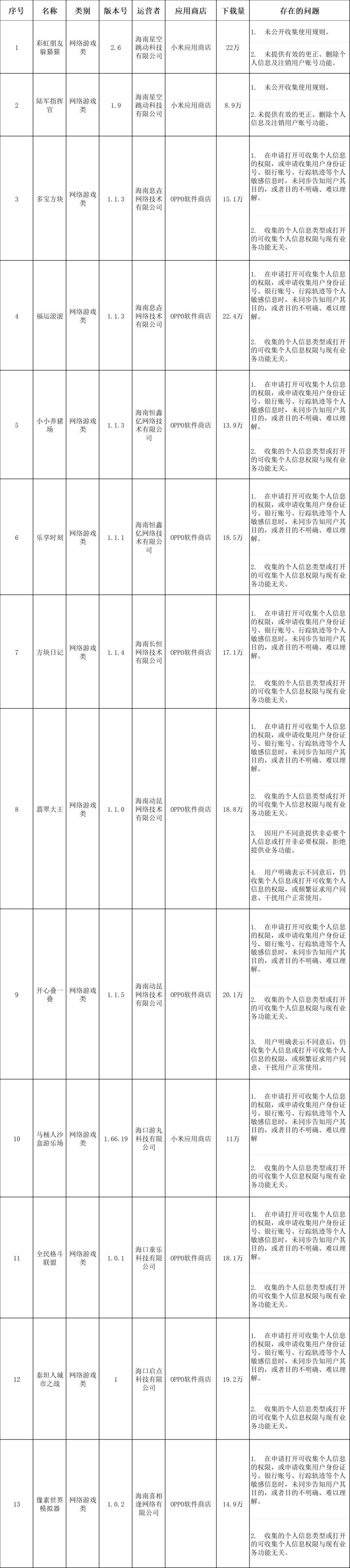 检测结果显示,彩虹朋友躲猫猫、陆军指挥官、多宝方块、福运滚滚、小小养猪场、乐享时刻、方块日记、翡翠大王、开心叠一叠、马桶人沙盒游乐场、全民格斗联盟、泰坦人城市之战、像素世界模拟器、小熊吃水果、智星足球比分、遇到她、小小组件、免听音乐、e椰城、滑滑视频等20款App均存在不同程度的非法获取、超范围收集、过度索权等违法违规收集使用个人信息行为,现集中向社会通报并责令相关运营单位限期整改。