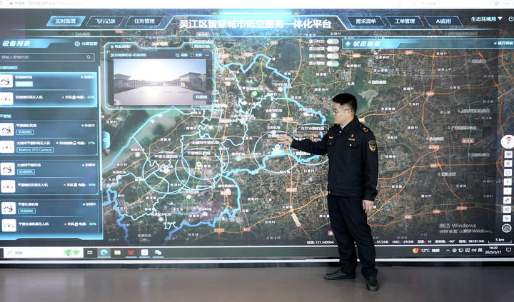 2025年3月17日,在江苏吴江太浦河驿站,当地生态环境部门工作人员介绍无人机巡航情况。新华社记者 季春鹏 摄