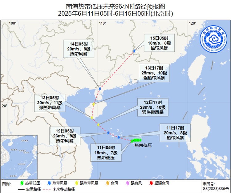 南海网、新海南客户端6月11日消息(记者 姚皓 通讯员 林俊汝 李凡 翁小芳)6月11日,记者从海南省气象台了解到,南海热带低压11日05时中心位于北纬15.7度、东经113.8度,也就是在西沙永兴岛东南方约200公里的南海中西部海面上,中心附近最大风力7级(15米/秒)。预计,该低压将以每小时10~15公里的速度向西偏北方向移动,强度逐渐加强,今天白天将加强为今年第1号台风,逐渐向海南岛东南部沿海靠近,并可能于13日在海南岛东南部沿海地区登陆(强热带风暴级到台风级,10~12级,25~33米/秒),之后转向东北方向移动,强度逐渐减弱。