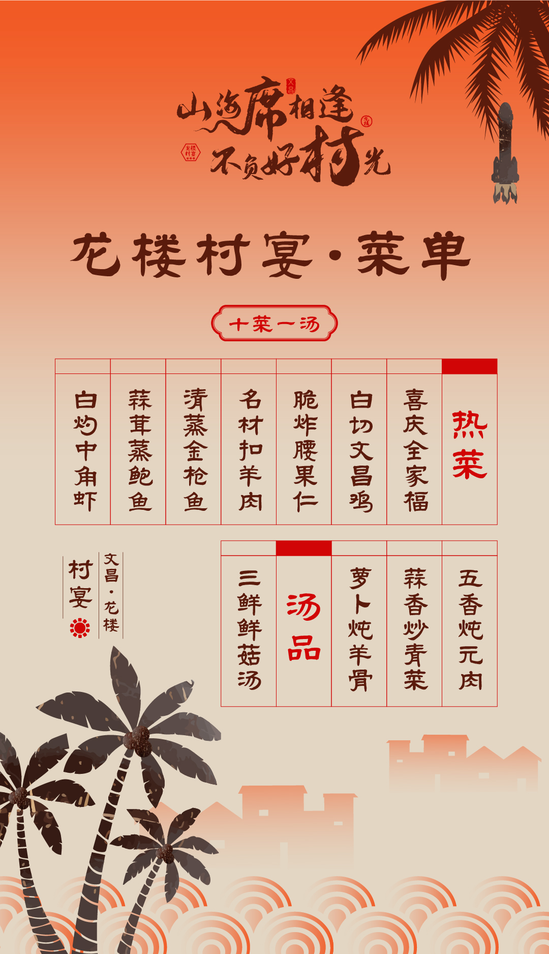 喜庆全家福、白切文昌鸡、白灼中角虾、五香炖元肉……龙楼村宴十菜一汤,由“琼菜人家”金牌村厨团队联合龙楼村厨,菜品设计既有宴席的隆重感,又不失农家菜的质朴温情,体现满满龙楼特色,满足了不同食客的口味需求。