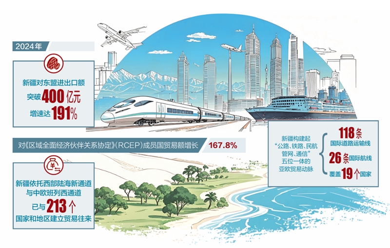 笛声长鸣,班列飞驰。在乌鲁木齐国际陆港区,满载机械设备与纺织品的列车正驶向东南亚;在北部湾,新疆的优质林果与番茄跨越山海登上货轮抵达东盟市场。在东盟连续5年稳居中国第一大贸易伙伴的背景下,作为“一带一路”核心区,中国新疆正以全方位开放姿态深化与东盟经贸合作。2024年,新疆对东盟进出口额突破400亿元,增速达191%;对《区域全面经济伙伴关系协定》(RCEP)成员国贸易额增长167.8%。