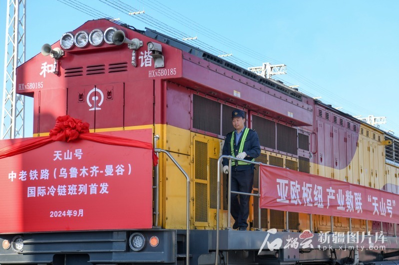 2024年9月24日,满载463.5吨新疆鲜食葡萄的国际冷链专列即将驶出乌鲁木齐国际陆港区。这趟班列经云南磨憨口岸出境,最终抵达泰国首都曼谷。(资料图)