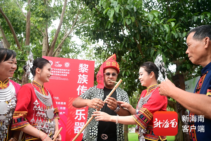 6月12日,三亚,海外传播官吉姆正在体验黎族传统乐器。记者 沙晓峰 摄