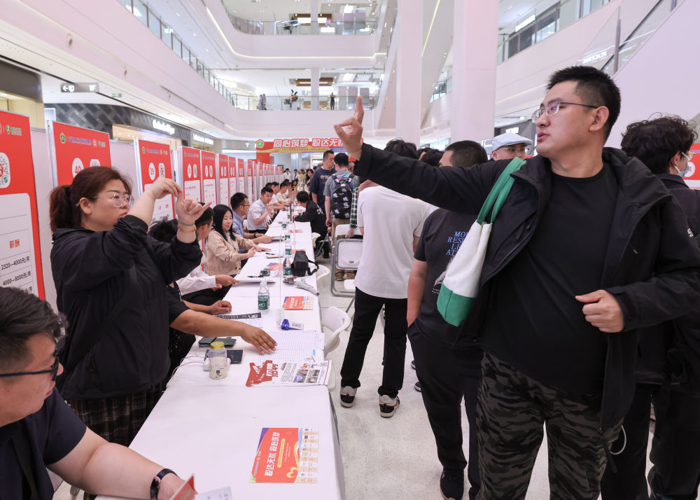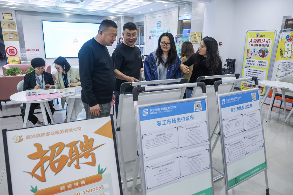 5月8日,在浙江省嘉兴市南湖区零工市场的一场零工招聘会上,求职者查看各类岗位。新华社记者 徐昱 摄