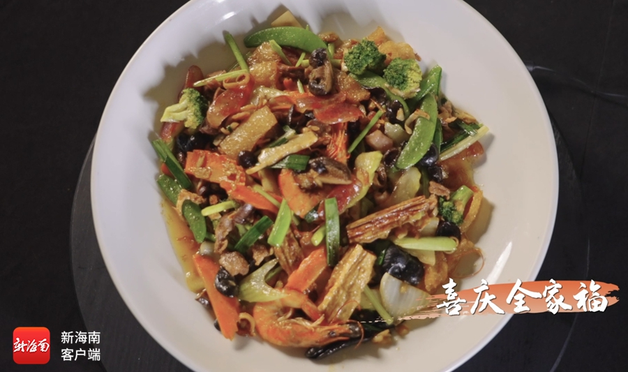 “一席村宴地不地道,头盘见真章。”蔡厨师首先介绍招牌菜“喜庆全家福”。这道承载着团圆美意的头盘菜,精选二十余种山珍海味——鱿鱼干、虾米提鲜,精选猪瘦肉增香,配以洋葱、胡萝卜等新鲜时蔬,在资深村厨的巧手下,化作一盘色如琥珀、香气四溢的佳肴。“头盘菜上桌,举箸同享,这才是文昌人待客的规矩。”蔡厨师的话语间满是自豪。