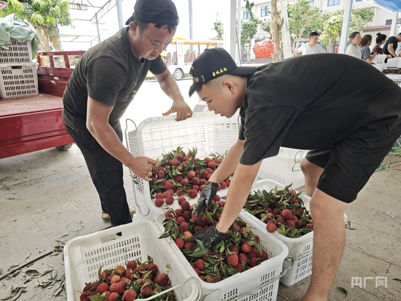 在永兴镇荔枝花海集散基地,一筐筐新鲜采摘下来的“荔枝王”经过称重、分拣、保鲜、打包等流程后装车发出,在严格品控和全程冷链保障下,让这份海南独有的甜蜜风味愈发飘香四方。