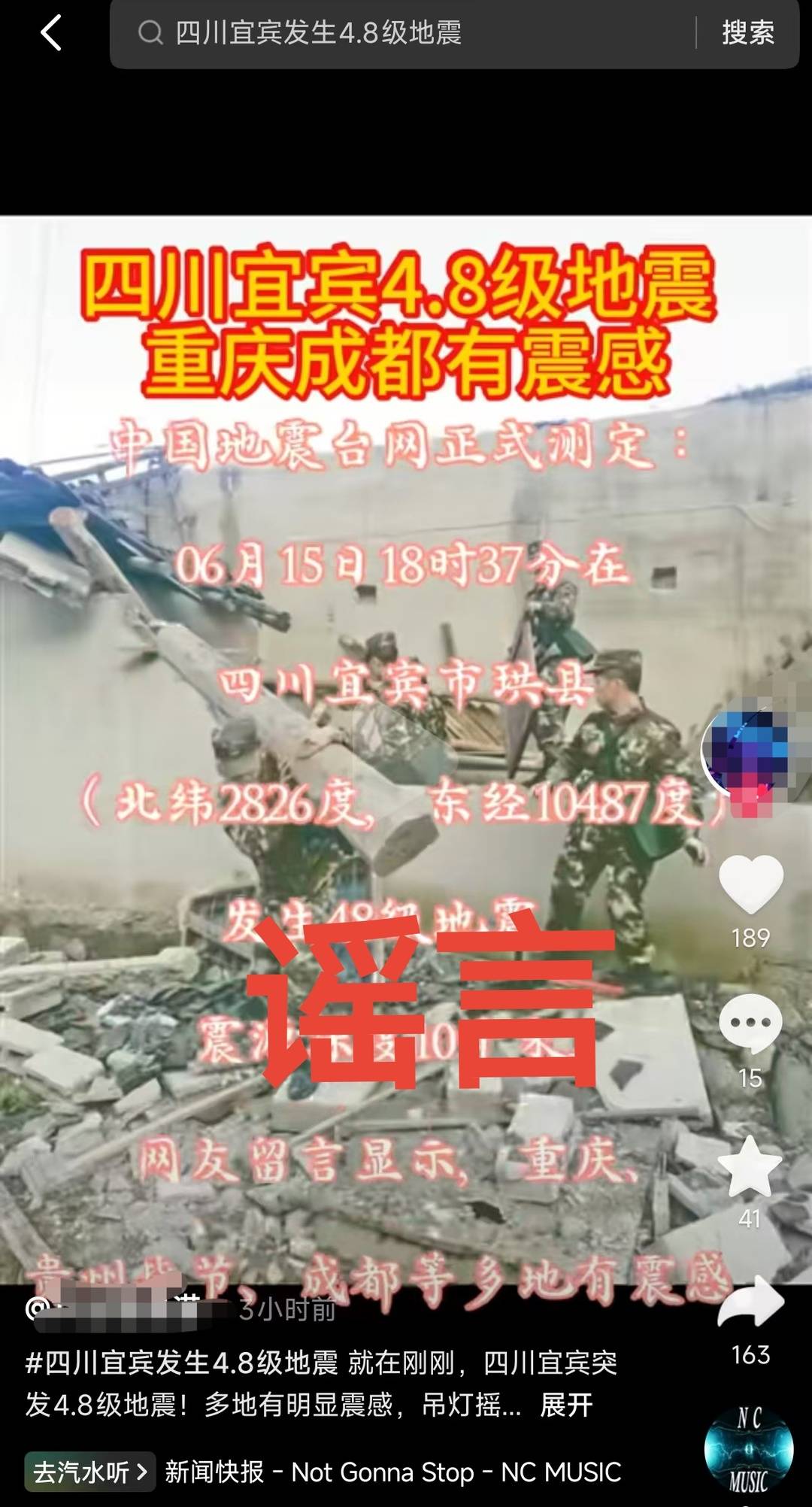 16日中午,记者从宜宾相关部门获悉,截至目前,此次地震中部分乡镇反馈有房屋受损,兴文县有2名群众受轻微伤,不存在上述网络信息中描述的多人伤亡、房屋倒塌等情况。目前,宜宾珙县网信部门已核查出一批关于此次地震的谣言信息,这些谣言信息混淆视听、误导网民,造成不良社会影响。其中,谣言信息包括:账号名称为“某某信息港”发布房屋倒塌和多人受伤画面,账号名称为“@某某某413”发布的房屋倒塌画面,账号名称为“@某然”发布的群众给人民子弟兵送锦旗画面,账号名称为“@某某看世界”发布的应急抢险救灾画面,账号名称为“某扬之”发布的道路垮塌画面,账号名称为“某阳花开心”发布的房屋废墟画面。经对比,以上账号推送的画面都不属于6月15日珙县4.8级地震导致,全部属于谣言。