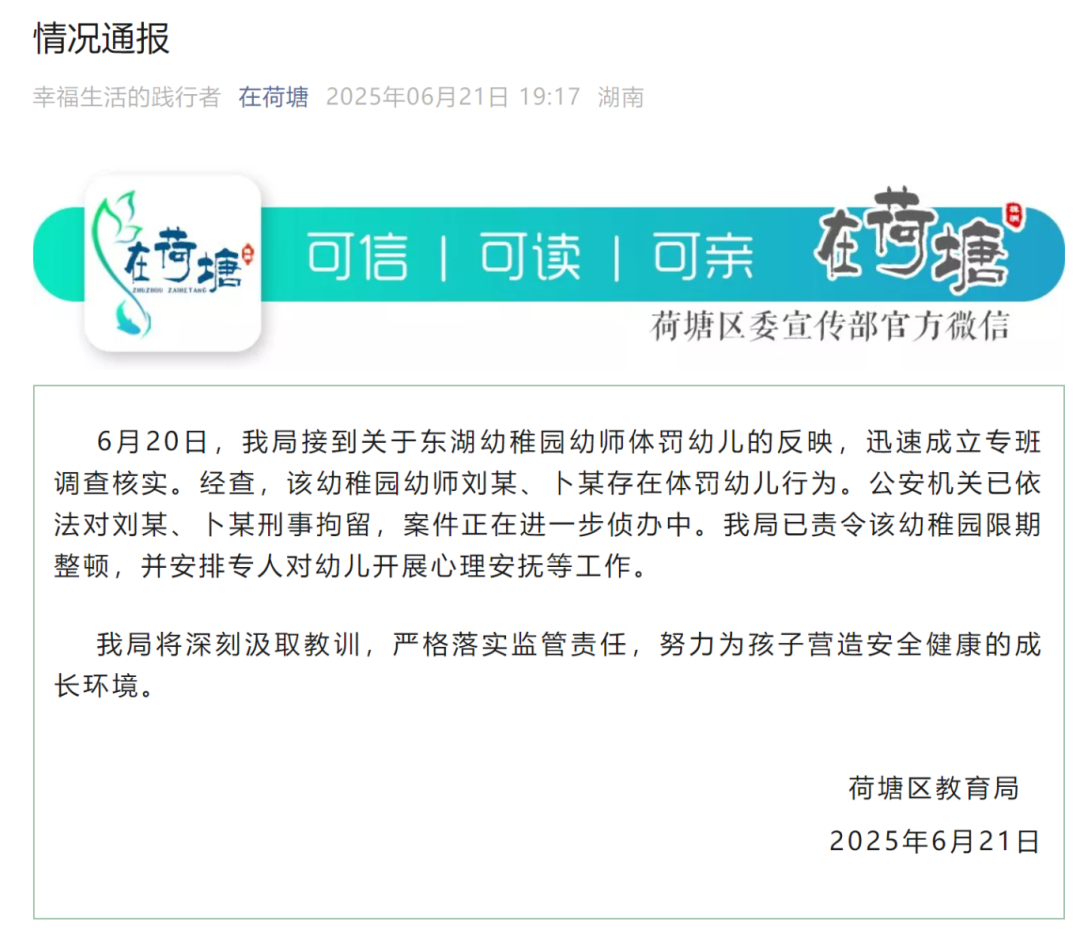 21日19时许,湖南株洲荷塘区教育局发布《情况通报》: