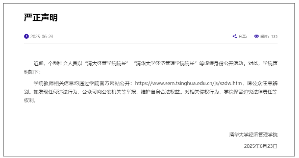 近期,网传个别社会人员以“清大经管学院院长”“清华大学经济管理学院院长”等虚假身份公开活动。23日,清华大学经济管理学院发布严正声明称,学院教师相关信息均通过学院官方网站公开,请公众注意辨别。如发现任何违法行为,公众可向公安机关等举报,维护自身合法权益。对相关侵权行为,学院保留追究法律责任等权利。