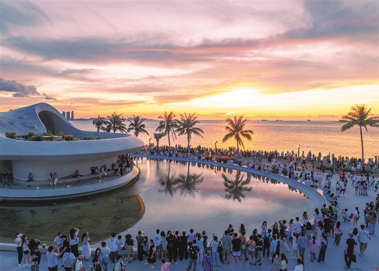 6月25日傍晚,海口湾再现美丽日落、晚霞,云洞图书馆外聚集了大量市民游客,人们纷纷举起手机拍摄美景。海南日报全媒体记者 李天平 摄