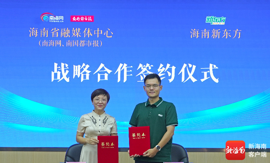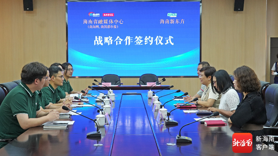 南海网、新海南客户端6月27日消息(记者 叶长文)6月27日上午,海南新东方教育培训中心有限公司与海南省融媒体中心战略合作签约仪式在海南日报新闻大厦二楼举行,双方将在教育垂类、文化旅游与乡村振兴三大领域展开深度合作。通过资源整合、渠道共建与科技赋能,助力海南自贸港文化教育事业与文旅产业升级,激发乡村振兴活力。海南省融媒体中心管委会副主任梁冬媛,海南新东方教育培训中心有限公司校长、新东方沃凯德(海南)文化旅行社有限公司总经理吴万宁等嘉宾出席活动,共同见证这一重要时刻。
