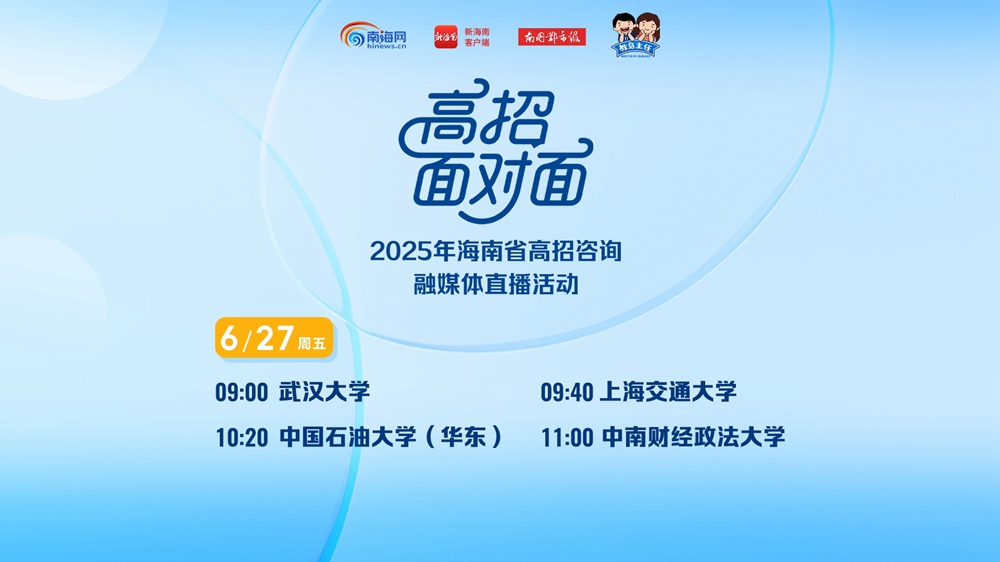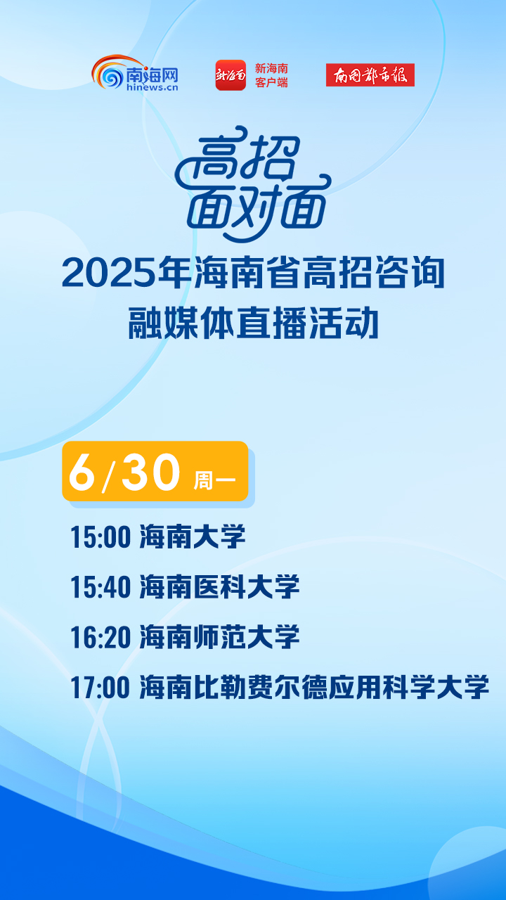 为给海南学子带来最贴近本省需求的招生政策解析与报考建议,6月30日15:00,2025年海南省高招咨询融媒体直播活动——“高招面对面”将邀请海南大学、海南医科大学、海南师范大学、海南比勒费尔德应用科学大学4所高校的招生负责人做客直播间,为在琼招生院校和海南考生、家长提供更多交流渠道。