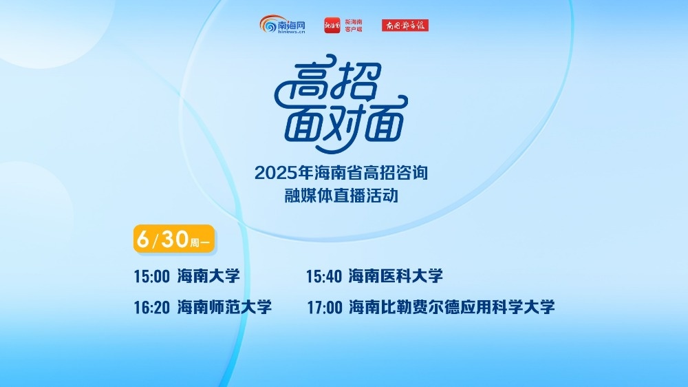 为给海南学子带来最贴近本省需求的招生政策解析与报考建议,7月2日15:00,2025年海南省高招咨询融媒体直播活动——“高招面对面”将继续邀请多所高校的招生负责人做客直播间,为在琼招生院校和海南考生、家长提供更多交流渠道。