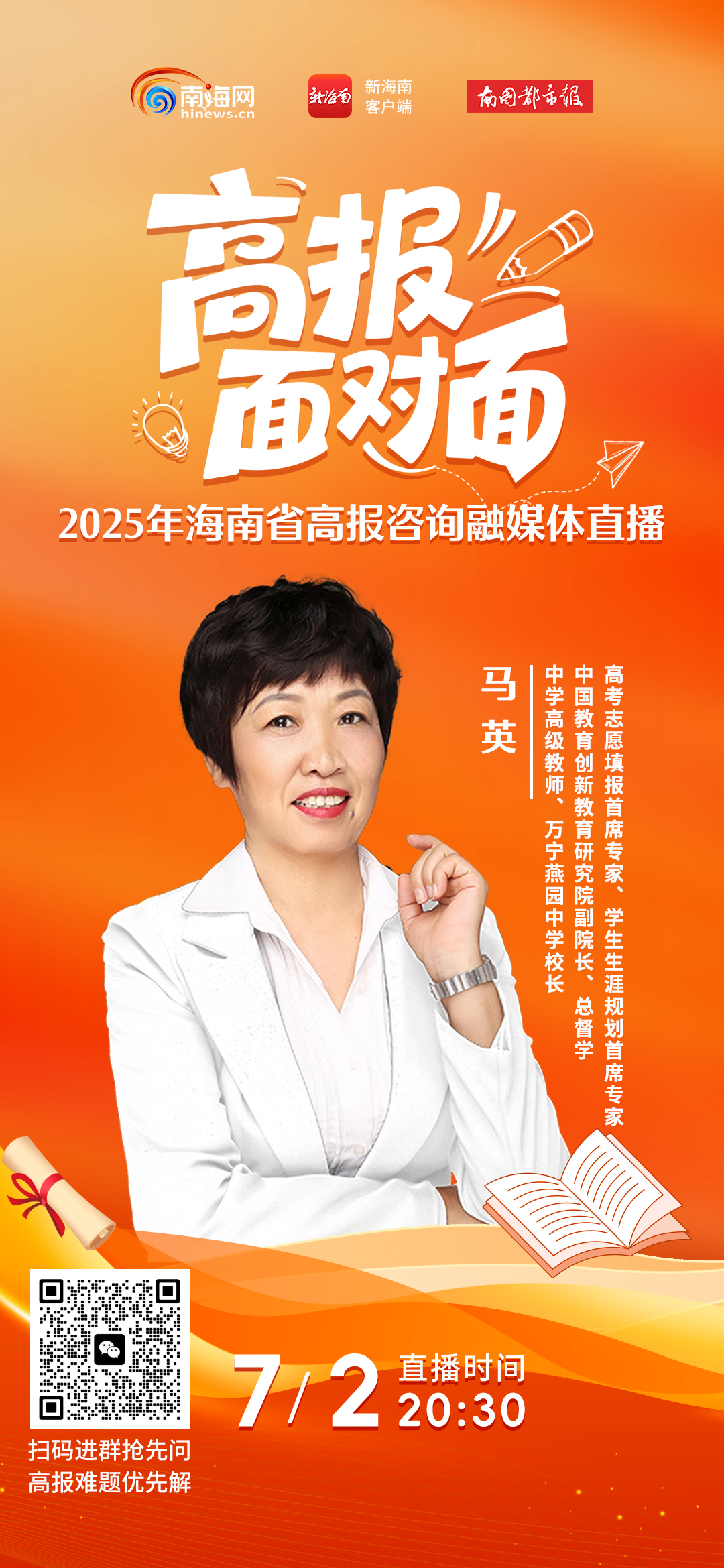 @海南考生家长 7月2日晚8点半,高考志愿填报专家直播间“支招”