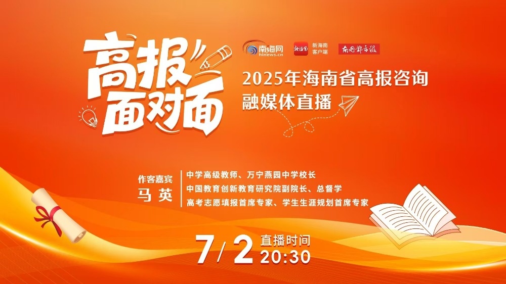 南海网、新海南客户端7月1日消息(记者 杜倬荷 实习生 王茜茜)各位考生家长注意了,您的高考志愿填报“智囊团”即将上线!7月2日(周三)晚8点30分,由新海南客户端、南海网、南国都市报主办的《高报面对面》直播专场即将开启。海南省资深高考报考金牌导师马英将做客直播间,为您“扫清”志愿填报迷雾,量身定制升学方案。