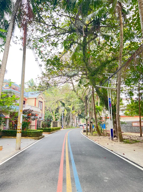 南海村位于文昌市文城镇东南部,距清澜港10公里,东面临海,海南环岛旅游公路贯穿了南海村21个村民小组,地理位置优越,交通便利,气候宜人,在这里能尽情感受乡村之美,享受一段乡村文旅之旅。南海村借助海南环岛旅游公路等优势,修建了一条红、黄、蓝三色的“彩虹道”,为骑行爱好者们铺就了一条诗情画意的骑行道路。