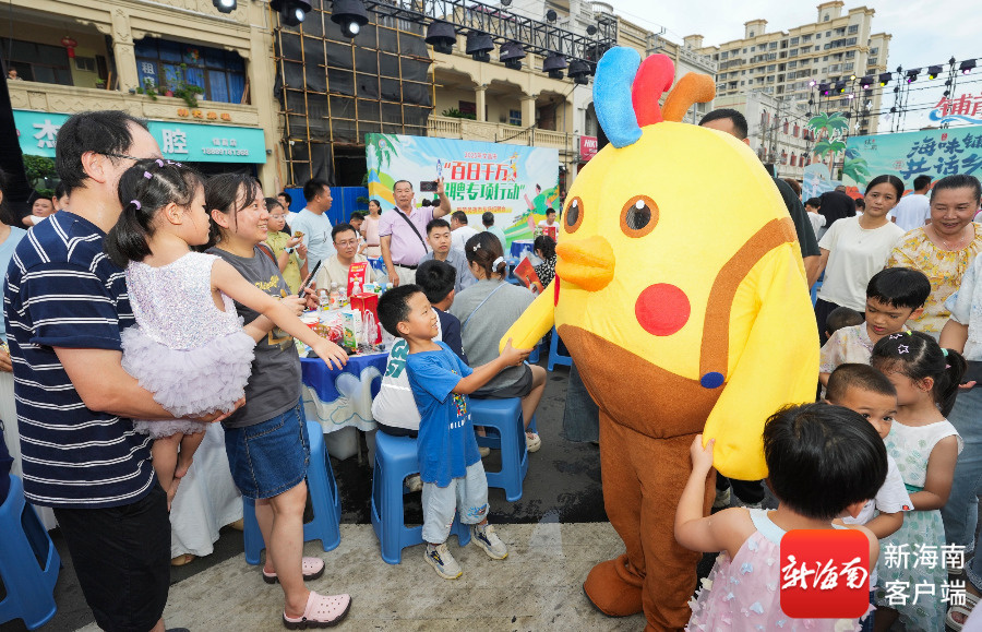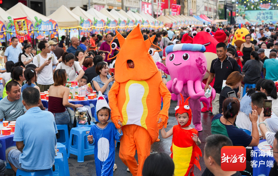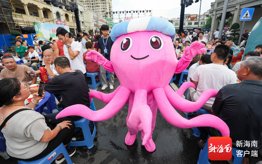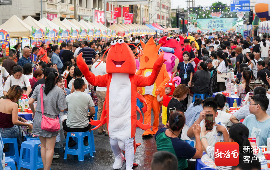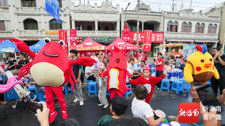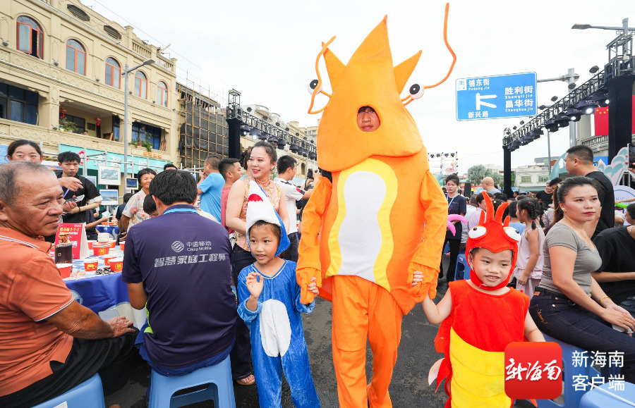 大虾昂首开道、螃蟹跳跃相随、文昌鸡街头漫步,还有龙虾挥钳、鱿鱼曼舞,市民游客捧着糟粕醋、高举马鲛鱼……一幅铺前渔港的丰饶画卷在铺前街头“活”了起来。