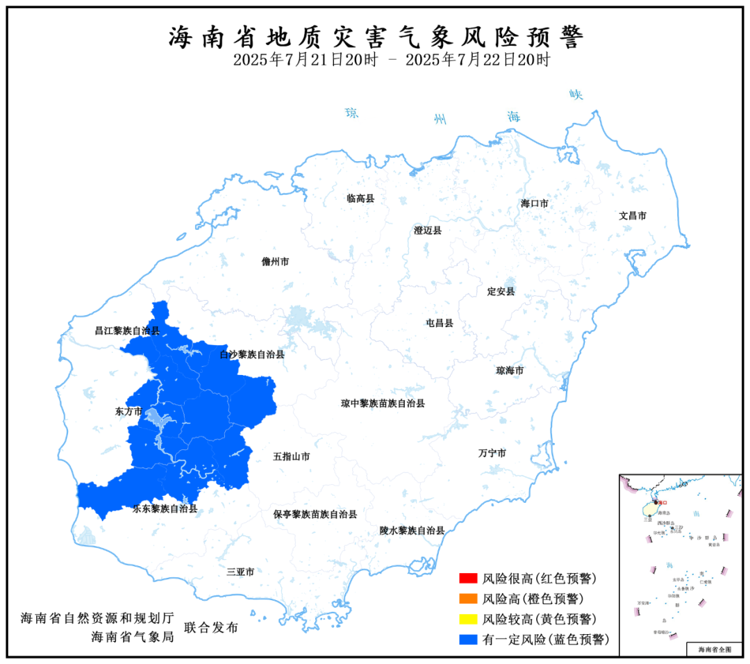东方市东河镇、江边乡,白沙县金波乡、青松乡、南开乡,昌江县七叉镇、叉河镇、王下乡、石碌镇,乐东县万冲镇、尖峰镇、抱由镇降雨诱发地质灾害有一定风险,为Ⅳ级风险预警(蓝色预警)。