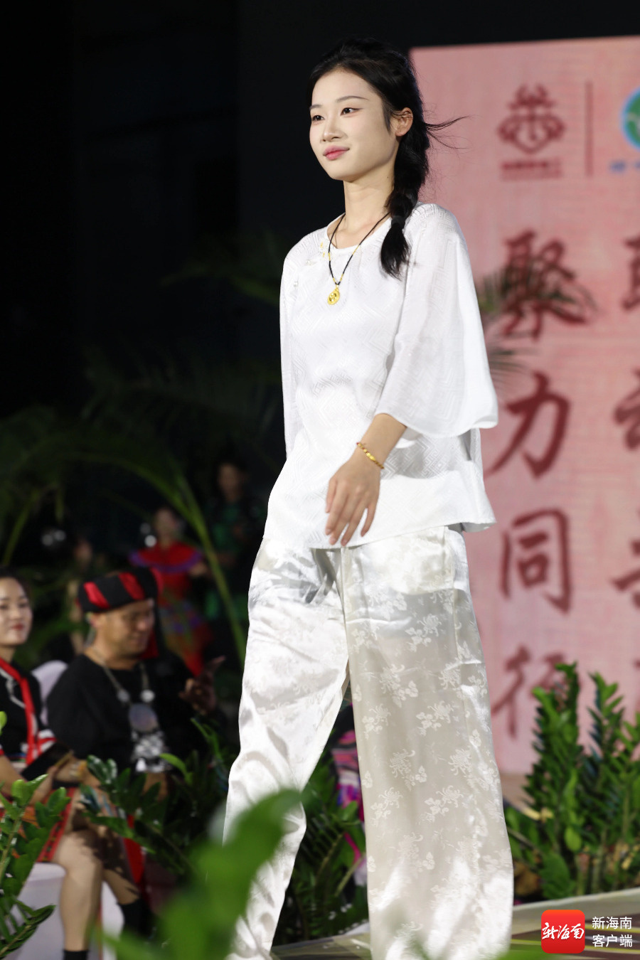 “快看!这套黎锦好像婚纱!”随着观众的惊叹,把活动推向高潮。身着精美黎锦服饰的模特款款走来,融合传统纹样与现代剪裁的黎锦服饰在聚光灯下依次绽放,让现场观众直观感受黎锦的时尚生命力。