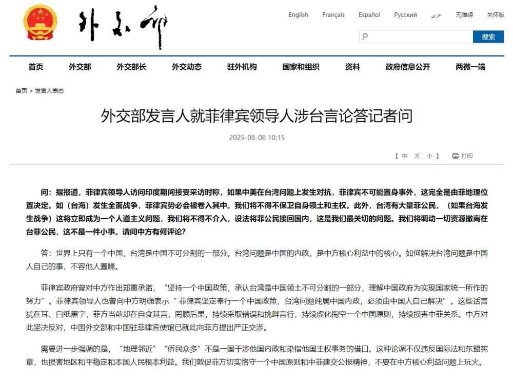 问:据报道,菲律宾领导人访问印度期间接受采访时称,如果中美在台湾问题上发生对抗,菲律宾不可能置身事外,这完全是由菲地理位置决定。如(台海)发生全面战争,菲律宾势必会被卷入其中。我们将不得不保卫自身领土和主权。此外,台湾有大量菲公民,(如果台海发生战争)这将立即成为一个人道主义问题,我们将不得不介入,设法将菲公民接回国内,这是我们最关切的问题。我们将调动一切资源撤离在台菲公民,这不是一件小事。请问中方有何评论?