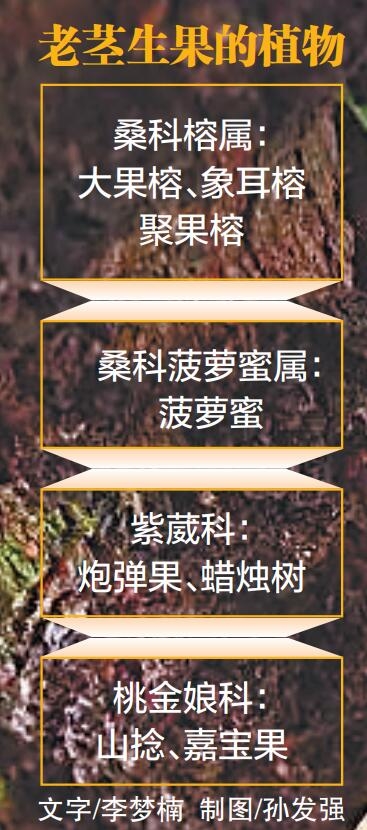 细细观察以上植物,便会发现其都有相似之处:主茎干粗壮,树皮较粗糙,果实多生长在主干或次主茎上,不在纤细枝条;多为小花大果,部分植物(如桑科榕属)为隐头花序,难以看到花。