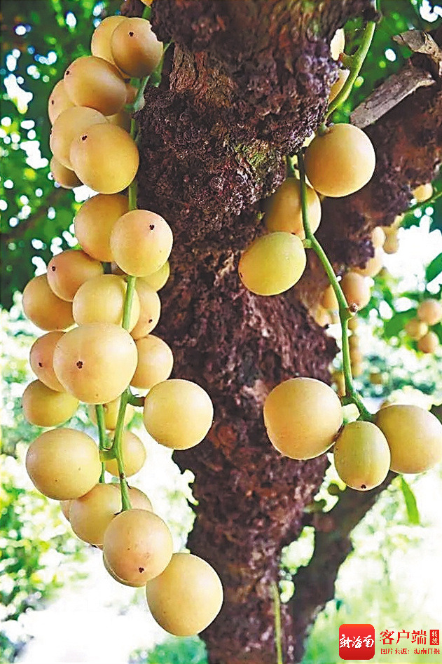 在海南的三亚、保亭、东方等地的热带雨林中,偶尔能在林间见到一种奇特果树——树身高大挺拔,树干和老杈上挂满了一串串圆滚滚的果实,这就是木奶果。