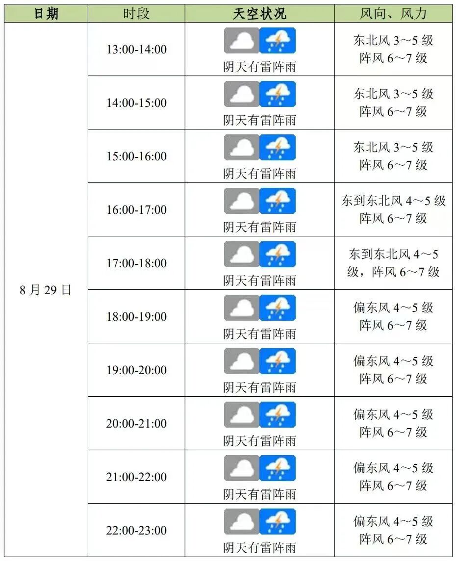 ● 今天白天到夜间,阴天间多云有暴雨,市区气温25-28℃,东到东北风4-5级,阵风6-8级,近海海面风力6-7级,雷雨时阵风8-9级;8月30日,阴天间多云有中到大雨,气温24-30℃。